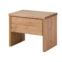 massiver Nachttisch aus Eiche in Natur geölt zusätzlicher Stauraum dank Schublade mit Push-to-Open-Technologie passt immer: minimalistisches Design bietet viele Kombinationsmöglichkeiten geölte Oberfläche betont die natürliche Textur des Holzes individuelle Optik durch natürliche Risse und Astlöcher in handverlesender Komposition toll in Kombination mit Balkenbetten der Serie JANGALI von ...