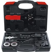 zur Demontage und Montage von Klimaanlagen-Kupplungen geeignet für folgende Klima-Kompressor-Kupplungen: Saden SD5, SD7, SD 505, 507, 510, 575, 708, 709 | Zexel (Mitsubishi) | Nippon Denso 6P, 10P | Chrysler C171 | Ford FS6 | Hitachi MJ | Tecumseh HR 980 | Delphi/Harrison (GM) R4, A6, HR-6, V5, DA6 verstellbare Stiftschlüssel Kupplungsreibplatten-Anzieher Abzieherplatte (2 / 3 Löcher), mit Spindel und Befestigungsschrauben Demontage-/Montagewerkzeug SAE-Gewinde, kugelgelagert Demontage-/Montagewerkzeug ISO-Gewinde, ...