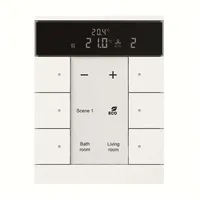 Frei konfigurierbares Multifunktionsbedienelement. Mit integriertem KNX-Busankoppler. Mit Beschriftungsfeld. Unterstützung der KNX-Funktionen durch innovatives Farbkonzept (gelb=Beleuchtung, blau=Jalousie, orange=RTR, magenta=Szene und weiß=neutral/keine Funktionszuordnung) oder Standardbeleuchtung rot/grün. Tasterfunktion: Schalten / Dimmen / Jalousie /Wert senden / Lichtszenen u.a. Zur Ansteuerung von Heizungs-, Lüftungs- und FanCoil-Aktoren. Master-/Slavebetrieb. Mit Grundlastbetrieb. Die Lüfterstufe kann manuell oder in den Automatikbetrieb geschaltet werden Klasse des Temperaturreglers: 1 Beitrag zur Raumheizungsenergieeffizienz: 1,0%. Anzahl Busteilnehmer: ...
