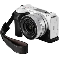 Schwarze Halbledertasche inkl. Handschlaufe für die Sony ZV-E10 II, Feststellschraube an der Unterseite mit integrierter 1/4"-20-Gewindebohrung für die direkte Stativbefestigung, Materialien: Leder, Aluminiumlegierung, ...