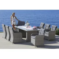 Bestseller. Produktdetails: Markeninformationen: Konifera, Eigenschaften: abnehmbarer Bezug, witterungsbeständig, Maßangaben: Belastbarkeit maximal: 110 kg, Material: Material: Aluminium, Polyrattan, Material Gestell: Aluminium, Material Füße: Aluminium, Materialzusammensetzung: Obermaterial: 100% Polyester, Materialhinweis: Die Möbel sind für den Außenbereich bestimmt,sollten jedoch für die Langlebigkeit nicht dauerhaft dem Regen ausgesetzt sein (trocken unterstellen)., Farbe: Farbbezeichnung: grau, Sitzmöbel: Farbe Sitzfläche: grau, Material Sitzfläche: Polyrattan, Material Sitzmöbel Gestell: Aluminium, Oberflächenbehandlung Sitzmöbel: pulverbeschichtet, Material Korpus: Polyrattan, Tisch: Anzahl Tische: 1 Stk., Form Tisch: rechteckig, Länge Tisch: 230 cm, Breite Tisch: 100 cm, Höhe Tisch: 74 cm, Höhe Tischunterkante: 68,5 cm, Materialstärke Tischplatte: 0,5 cm, Material Tischplatte: Sicherheitsglas, Oberflächenbehandlung Tischplatte: Glas- und Polyrattan, Material Tisch Gestell: Aluminium, Oberflächenbehandlung Tischgestell: pulverbeschichtet, Sessel: Anzahl Sessel: 8 Stk., Breite Sessel: 62 cm, Tiefe Sessel: 65 cm, Höhe Sessel: 92,5 cm, Sitzbreite Sessel: 53 cm, Sitztiefe Sessel: 50 cm, Sitzhöhe Sessel: 42 cm, Breite Armlehnen Sessel: 4,5 cm, Höhe Rückenlehne Sessel: 54 cm, Auflagen: Anzahl Auflagen: 16 Stk., Farbe Auflagen: dunkelgrau, Design Auflagen: uni, Materialstärken Auflagen: 8 cm, Pflegehinweise Auflagen: Handwäsche, Verschluss Auflagen: Reißverschluss, Lieferung & Montage: Lieferzustand: vormontiert, Hinweise: Pflegehinweise: Bitte beachten Sie die Pflegehinweise gemäß dem beiliegenden Produkt- und Materialpass., Hinweise: Lieferung ohne Dekoration, Zierkissen nicht im Lieferumfang enthalten, Aufbauhinweise: einfache Selbstmontage mit Aufbauanleitung, Wissenswertes: Zur Reinigung nur Wasser oder ein sanftes Reinigungsmittel verwenden. Mit einem sauberen Tuch trocken wischen.n- Lagern Sie das Produkt bei Nichtgebrauch an einem kühlen und trockenen Ort im Haus. Denken Sie daran, sie zu reinigen und gründlich trocknen zu lassen, bevor Sie sie weglegen. n- Recyceln Sie das ausrangierte Produkt an der dafür vorgesehenen Stelle. n- Berühren Sie das Produkt nicht mit scharfen Gegenständen., Serienhinweise: Menorca, Hinweis Maßangaben: Alle Angaben sind ...