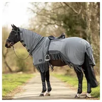 Prima Schutz beim Ausreiten im Englischsattel Die Busse Fliegen- / Ausreitdecke MOSKITO-FRANSEN III bietet beim Reiten im klassischen Sattel Schutz gegen stechende Plagegeister. Die extralangen Fransen am unteren Deckenrand bewegen sich beim Reiten hin und her und halten dadurch lästige Insekten vom Bauch des Pferdes fern. Halter von empfindlichen oder schreckhaften Pferden schwören auf die effektive Wirkungsweise und die gute Passform der Decke.Auf einen BlickEngmaschiges, strapazierfähiges Netzmaterial 100% PolyesterExtralange Fransen am unteren DeckenrandSeitlicher Riding-Cut für ungestörte HilfengebungSattelausschnitt für englische SättelIntegriertes Halsteil einrollbarGroßzügiger SchweiflatzDoppelte verstellbare Clip-BrustverschlüsseHalsteil mit KlettverschlüssenTiefe HinterhandkordelSchnitt für gute Bewegung Die Busse Fliegendecke / Ausreitdecke MOSKITO-FRANSEN III ist so geschnitten, dass möglichst viele Körperbereiche des Pferdes vor Insekten geschützt sind, aber dennoch genügend Bewegungsfreiheit für Pferd und Reiter besteht. So hat die Decke im Bauchbereich eine Aussparung, damit Schenkelkontakt und die Hilfengebung noch klar beim Pferd ankommen. Material Die hochwertige Busse Fliegendecke ist engmaschig und aus einem luftig-leichtem Netz aus Polyester gearbeitet. Trotz der Leichtigkeit dieser dünnen Sommerdecke für Pferde ist sie auch reißfest. Befestigung Die Decken wird vorne an der Brust mit zwei Snap Verschlüssen befestigt. Am Rücken verfügt die Decke über eine Aussparung für klassische Sättel. Die Decke hat auch einen Schweifschutz mit Schweifriemen. Halsteil Das an der Decke fixierte Halsteil mit Stirnriemen ist über die Klettverschlüsse größenverstellbar und kann bei Nichtgebrauch eingerollt werden. Varianten-Tipp Die Ausreitdecke Moskito-Fransen III von Busse ist eine Fliegen-Ausreitdecke mit extra Fransen am unteren Deckenende, welche für ungestörten Reitspaß sorgt. Das engmaschige, strapazierfähige Netzmaterial schützt dein Pferd vor nervigen Insekten und ist dabei trotzdem atmungsaktiv. Das Halsteil der Decke ist herunterrollbar und kann mit Klettverschlüssen an der Trense befestigt werden. Die zwei längeneinstellbare PVC-Snap-Verschlüsse im Brustbereich sorgen für einen optimalen Halt der Ausreitdecke.Alle Vorteile auf einen Blick:Fliegen-AusreitdeckeFransen am DeckenendeSchutz vor Insektenatmungsaktivungestörte und sensible Hilfengebungzwei längeneinstellbare PVC-Snap-Verschlüsseherunterrollbares Halsteil Fliegen-Ausreitdecke für ungestörten Reitspaß mit extra Fransen am unteren Deckenende, welche sich beim Reiten hin und her bewegen und so lästige Insekten vertreiben Material/Materialfunktion:engmaschiges, strapazierfähiges Netzmaterial100% Polyester Passform/Ausstattung:Halsteil mit Klettverschlüssen, auch herunterrollbar und mit Bändern sicher zu befestigenHalsteil kann mit Klettschlaufen an Trense befestigt werdenoptimierter Ausschnitt für Englische Sättelzuverlässige Klett-Verschlüsse im Brustbereichmit Schweifabdeckung und tiefer ...