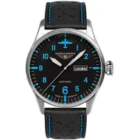 GEHÄUSE Gehäuse ausEdelstahlForm des GehäusesRundFarbe des GehäusesSilberGlasMineralglas UHRWERK Art der AnzeigeAnalogUhrwerkAutomatik ZIFFERNBLATT Farbe des ZiffernblattsSchwarz ARMBAND Farbe des ArmbandsSchwarzArmband ausLeder TECHNISCHE DATEN Durchmesser (ohne Krone) in mm / Zoll42,00 / 1,65Höhe in mm / Zoll13,00 / 0,51Wasserdicht bis (bar)5,00 GEHÄUSE - Gehäuse aus: Edelstahl - Form des Gehäuses: Rund - Farbe des Gehäuses: Silber - Glas: Mineralglas UHRWERK - Art der Anzeige: Analog - Uhrwerk: Automatik ZIFFERNBLATT - Farbe des Ziffernblatts: Schwarz ARMBAND - Farbe des Armbands: Schwarz - Armband aus: Leder WEITERE ANGABEN - Produkt: Uhr - Hersteller: Bauhaus TECHNISCHE DATEN - Durchmesser (ohne Krone) in mm / Zoll: 42,00 / 1,65 - Höhe in mm / Zoll: 13,00 / 0,51 - Wasserdicht bis (bar): 5,00 Die Bauhaus Aviation Automatik Herrenuhr beeindruckt durch ein markantes, klassisches Design und hochwertige Verarbeitung. Auf dem schwarzen Zifferblatt mit leuchtend blauen arabischen Zahlen stechen silberne Stunden- und Minutenzeiger sowie ein weißer Sekundenzeiger hervor. Eine elegante Datumsanzeige bei 03:00 sowie ein stilisiertes Flugzeugsymbol unterstreichen den luftfahrtinspirierten Look und verleihen der Uhr einen Hauch von Vintage-Flair.Gefertigt in Deutschland in Ruhla, verfügt sie über ein robustes Edelstahlgehäuse mit verschraubtem Boden und flachem Mineralglas. Wasserdicht bis 5 ATM vereint die Uhr klassischen Charme mit moderner Technik und ist der ideale Alltagsbegleiter für anspruchsvolle ...