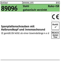 Artikel 89096 Stahl CE Ruko-ISR galvanisch verzinkt Spanplattenschrauben · Halbrundkopf · ISR = Innensechsrund · Fachhandel - Abmessung: 5 x 60 -T25 VE=FS (200 Stück) Weitere technische Eigenschaften: · Gruppencode: 89096.015 · Norm: REYHER-Artikel ...